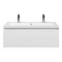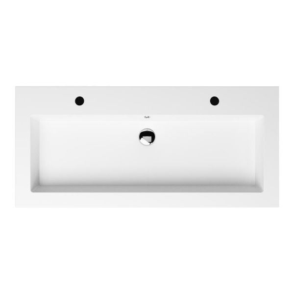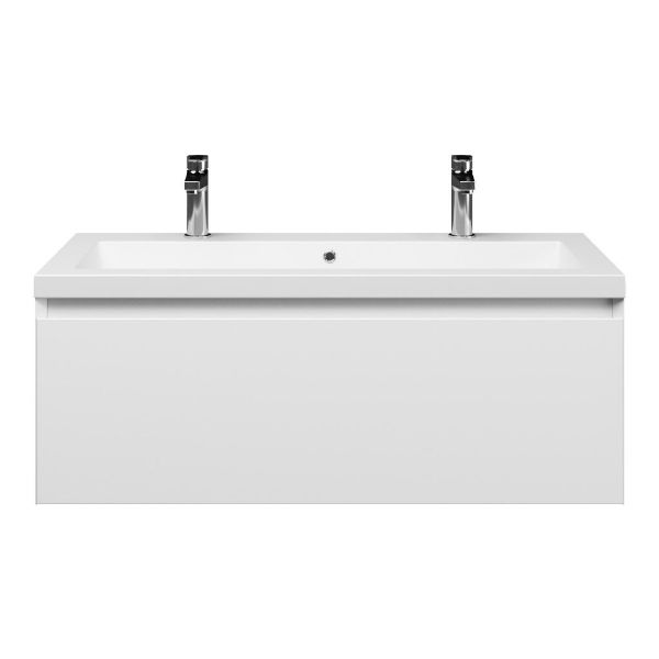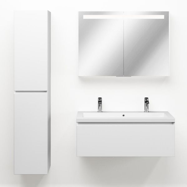 Greeploos badkamermeubel in de kleur wit mat is 100 cm breed. De wastafel is vervaardig in quartz en heeft de kleur wit mat quartz. Dit badkamermeubel met deze wastafel is leverbaar tussen de 60 cm t/m 160 cm