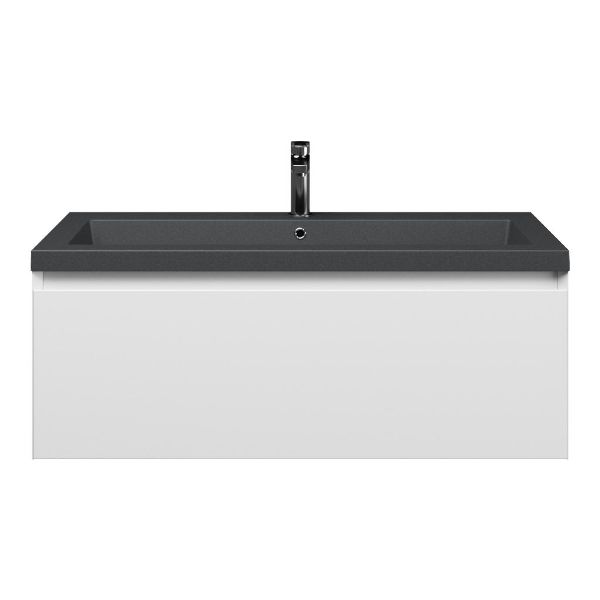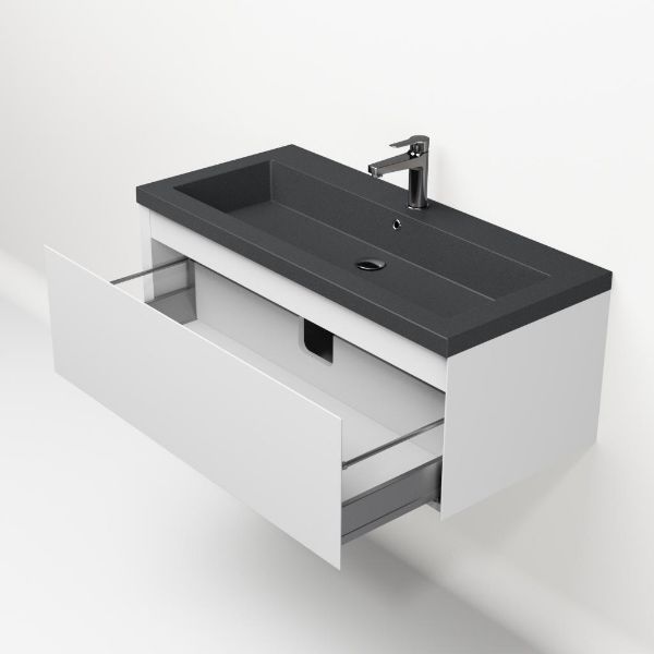 Greeploos badkamermeubel in de kleur wit mat is 100 cm breed. De wastafel is vervaardig in quartz en heeft de kleur grijs mat quartz. Dit badkamermeubel met deze wastafel is leverbaar tussen de 60 cm t/m 160 cm