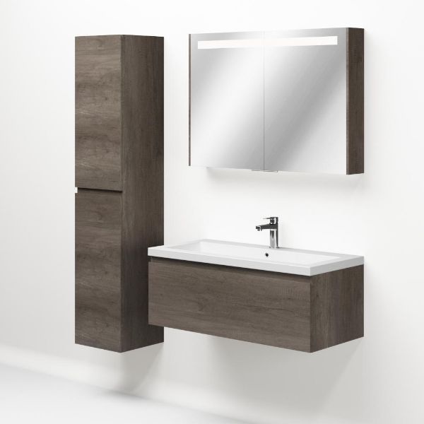 Greeploos badkamermeubel in de kleur olm donker grijs is 100 cm breed. De wastafel is vervaardig in quartz en heeft de kleur wit mat quartz. Dit badkamermeubel met deze wastafel is leverbaar tussen de 60 cm t/m 160 cm