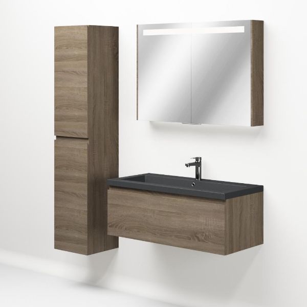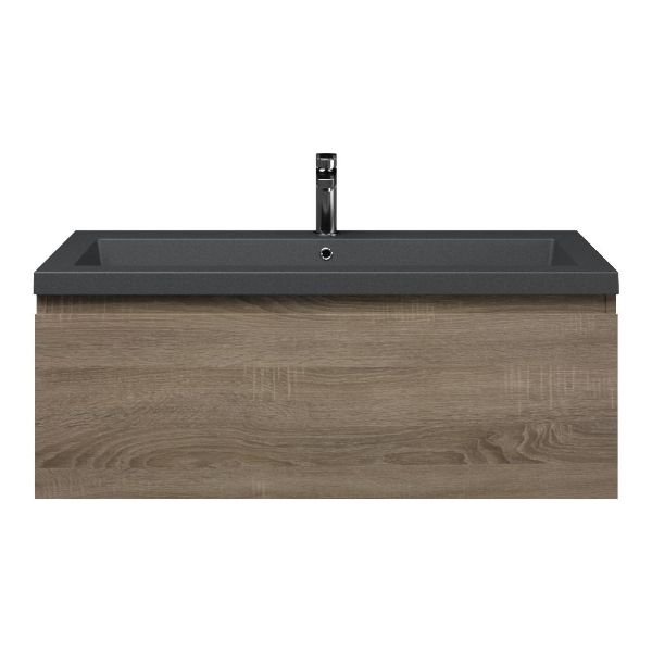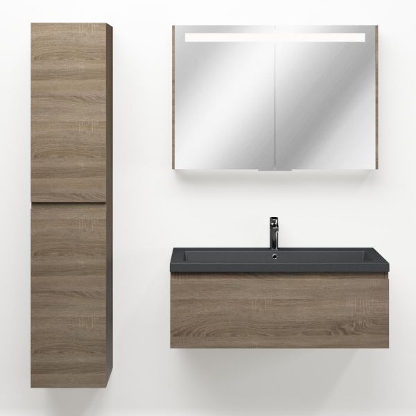 Greeploos badkamermeubel in de kleur eiken donker is 100 cm breed. De wastafel is vervaardig in quartz en heeft de kleur grijs mat quartz. Dit badkamermeubel met deze wastafel is leverbaar tussen de 60 cm t/m 160 cm