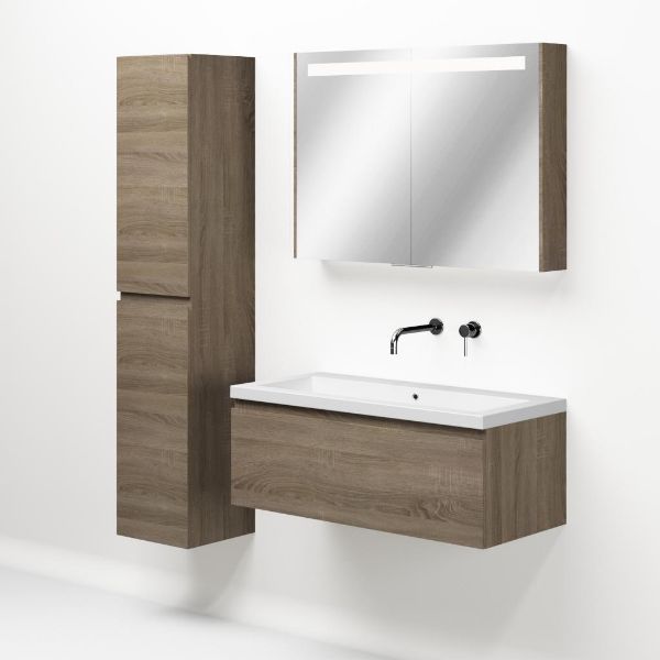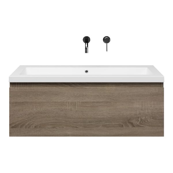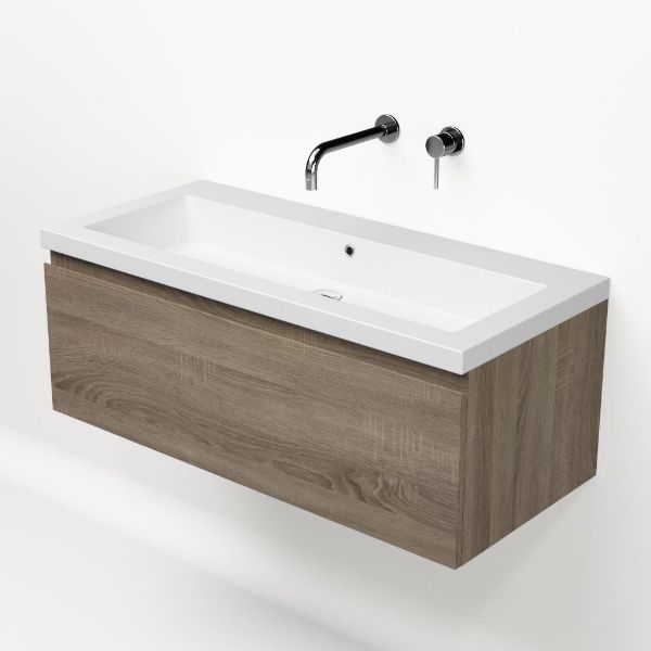Greeploos badkamermeubel in de kleur eiken donker is 100 cm breed. De wastafel is vervaardig in quartz en heeft de kleur wit mat quartz. Dit badkamermeubel met deze wastafel is leverbaar tussen de 60 cm t/m 160 cm