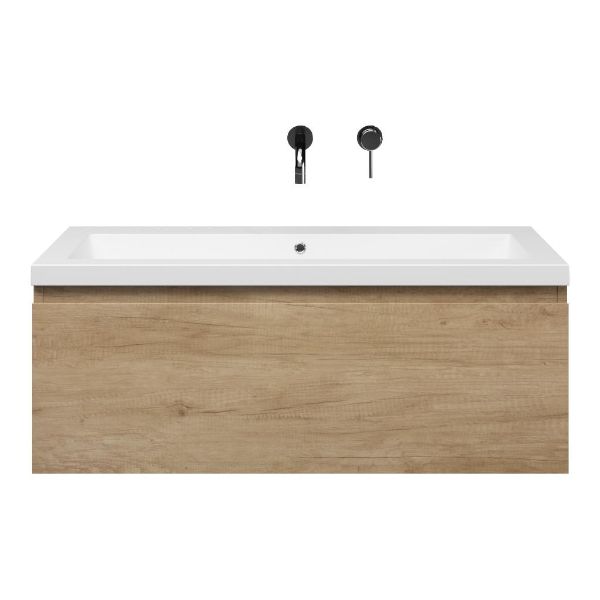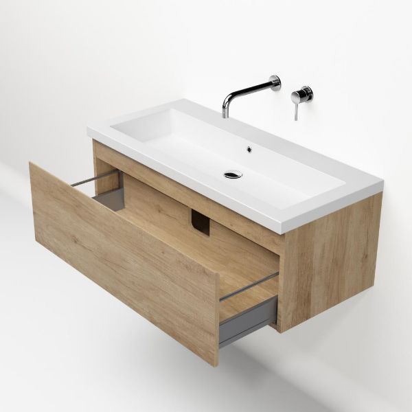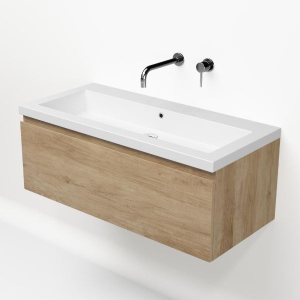 Greeploos badkamermeubel in de kleur olm is 100 cm breed. De wastafel is vervaardig in quartz en heeft de kleur wit mat quartz. Dit badkamermeubel met deze wastafel is leverbaar tussen de 60 cm t/m 160 cm