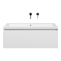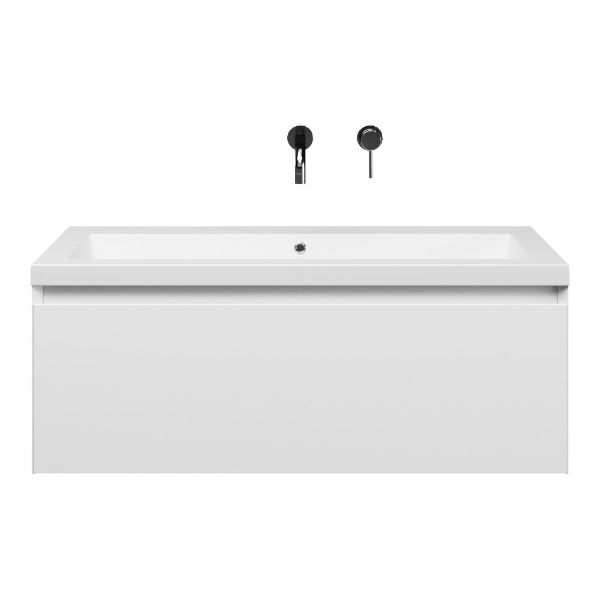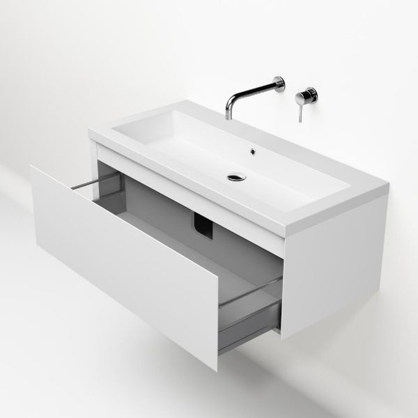 Greeploos badkamermeubel in de kleur wit mat is 100 cm breed. De wastafel is vervaardig in quartz en heeft de kleur wit mat quartz. Dit badkamermeubel met deze wastafel is leverbaar tussen de 60 cm t/m 160 cm