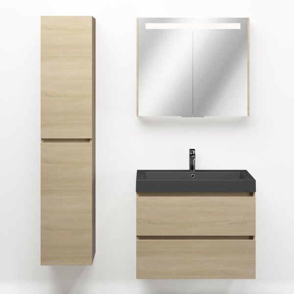 Greeploos badkamermeubel in de kleur eiken licht is 80 cm breed. De wastafel is vervaardig in quartz en heeft de kleur grijs mat quartz. Dit badkamermeubel met deze wastafel is leverbaar tussen de 60 cm t/m 200 cm