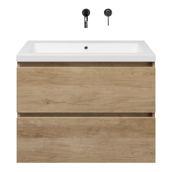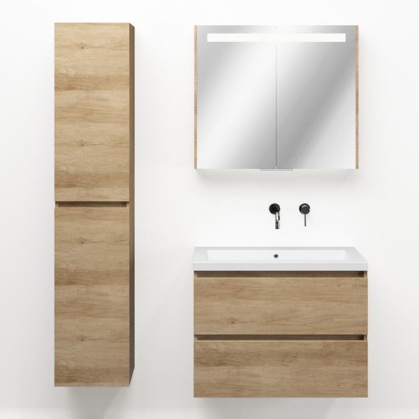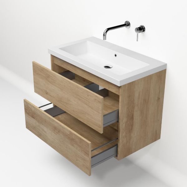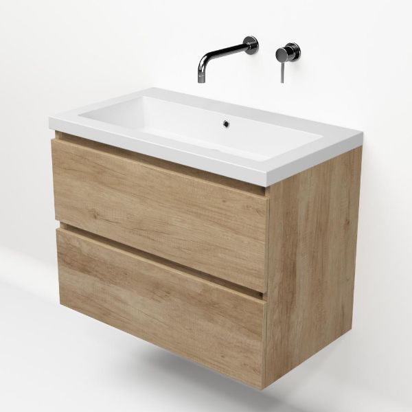 Greeploos badkamermeubel in de kleur olm is 80 cm breed. De wastafel is vervaardig in quartz en heeft de kleur wit mat quartz. Dit badkamermeubel met deze wastafel is leverbaar tussen de 60 cm t/m 200 cm