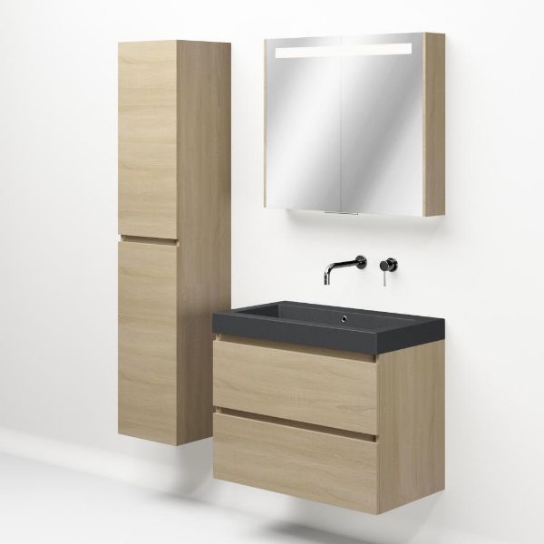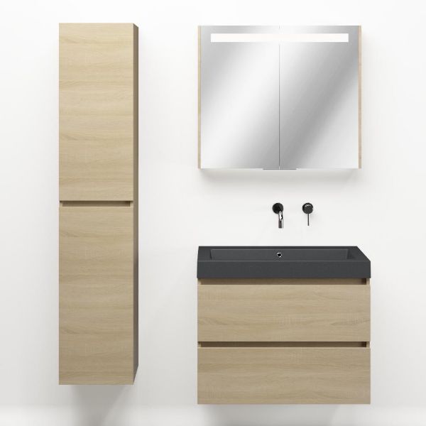 Greeploos badkamermeubel in de kleur eiken licht is 80 cm breed. De wastafel is vervaardig in quartz en heeft de kleur grijs mat quartz. Dit badkamermeubel met deze wastafel is leverbaar tussen de 60 cm t/m 200 cm