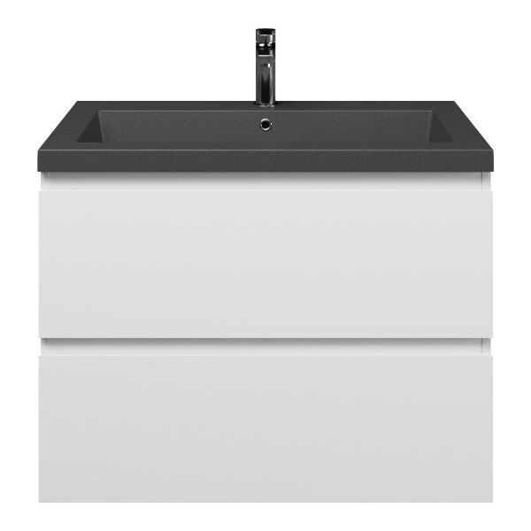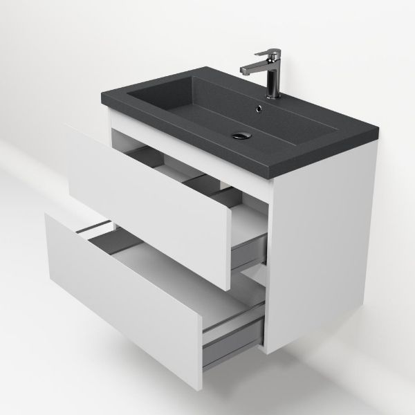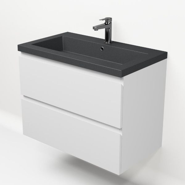 Greeploos badkamermeubel in de kleur wit mat is 80 cm breed. De wastafel is vervaardig in quartz en heeft de kleur grijs mat quartz. Dit badkamermeubel met deze wastafel is leverbaar tussen de 60 cm t/m 200 cm