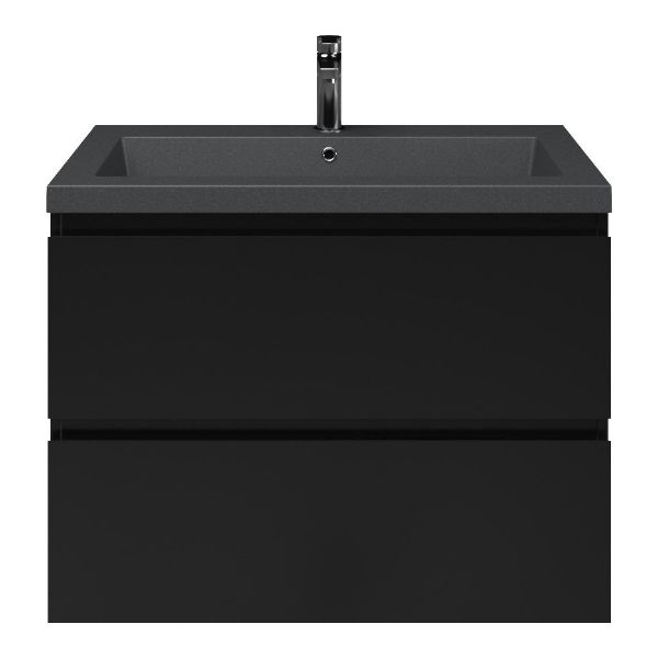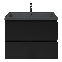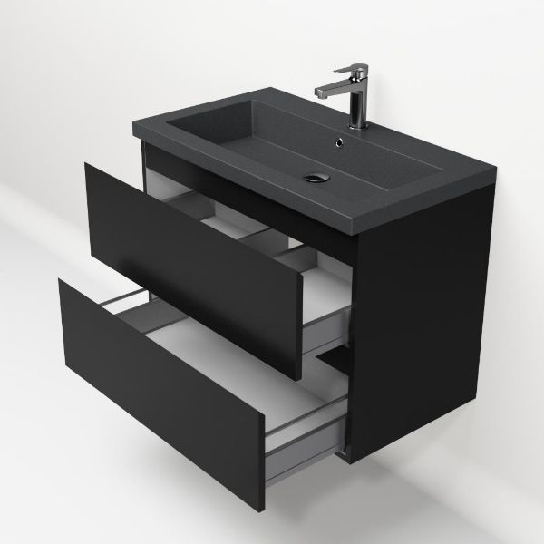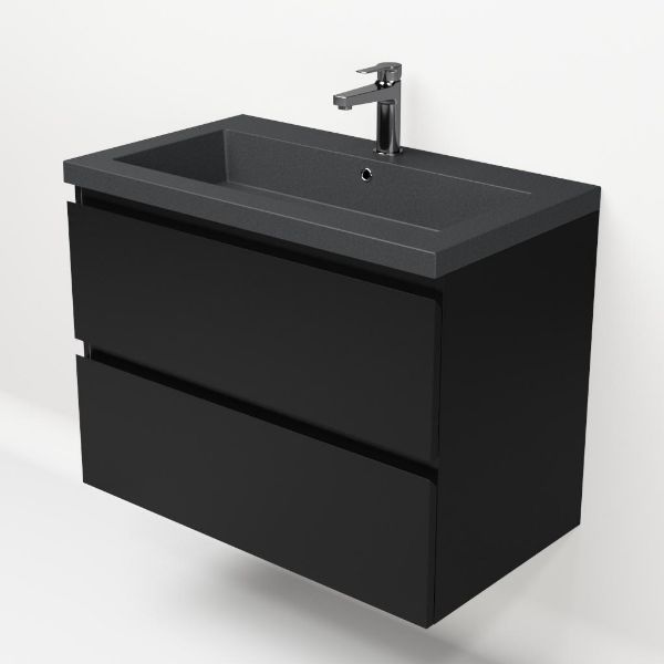 Greeploos badkamermeubel in de kleur zwart mat is 80 cm breed. De wastafel is vervaardig in quartz en heeft de kleur grijs mat quartz. Dit badkamermeubel met deze wastafel is leverbaar tussen de 60 cm t/m 200 cm