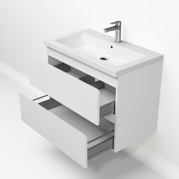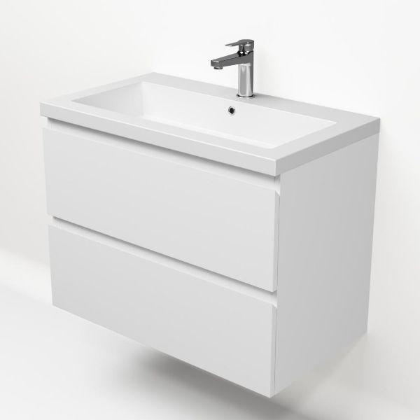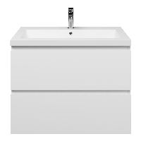 Greeploos badkamermeubel in de kleur wit mat is 80 cm breed. De wastafel is vervaardig in quartz en heeft de kleur wit mat quartz. Dit badkamermeubel met deze wastafel is leverbaar tussen de 60 cm t/m 200 cm