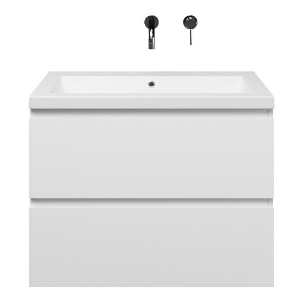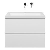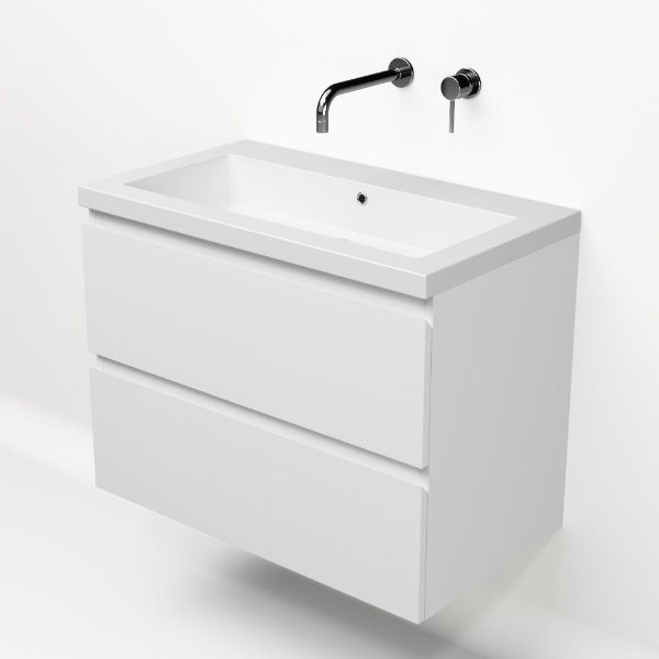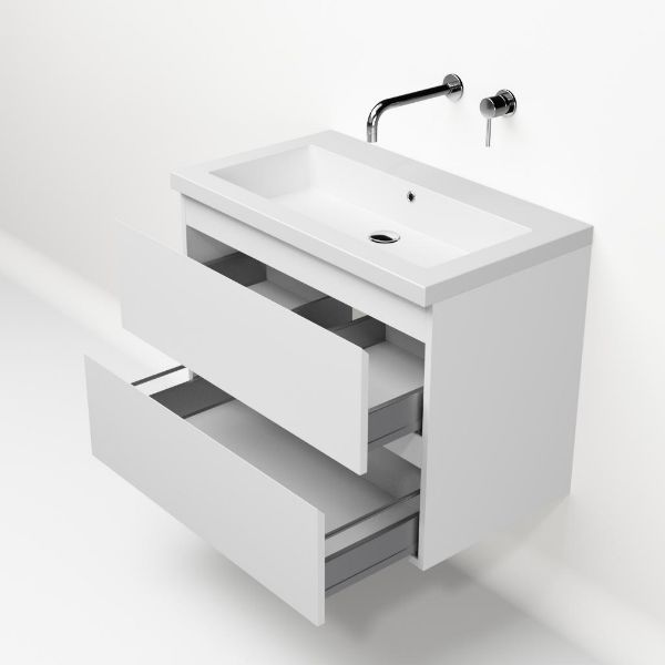 Greeploos badkamermeubel in de kleur wit mat is 80 cm breed.  De wastafel is vervaardig in quartz en heeft de kleur wit mat quartz. Dit badkamermeubel met deze wastafel is leverbaar tussen de 60 cm t/m 200 cm