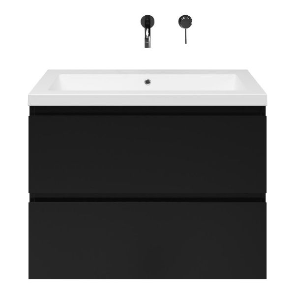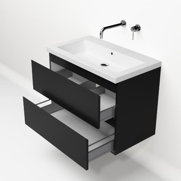Greeploos badkamermeubel in de kleur zwart mat is 80 cm breed. De wastafel is vervaardig in quartz en heeft de kleur wit mat quartz. Dit badkamermeubel met deze wastafel is leverbaar tussen de 60 cm t/m 200 cm