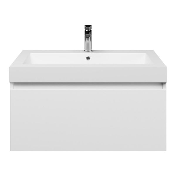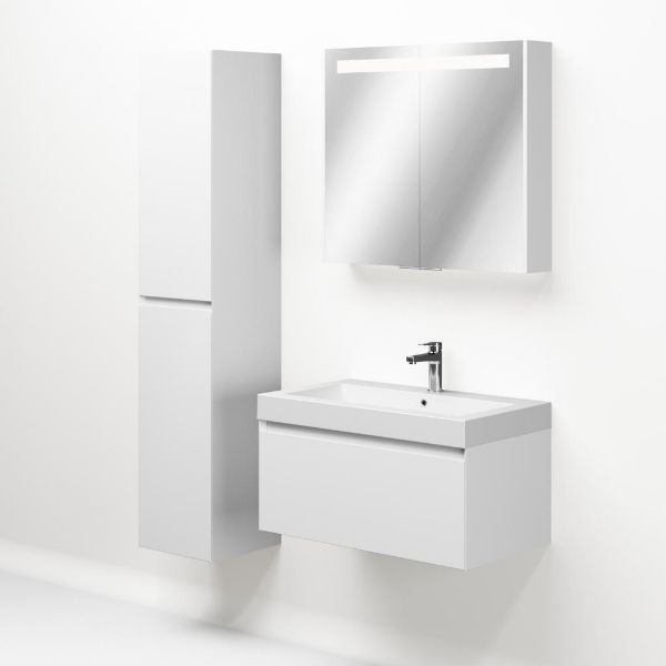 Greeploos badkamermeubel in de kleur wit mat is 80 cm breed. De wastafel is vervaardig in quartz en heeft de kleur wit mat quartz. Dit badkamermeubel met deze wastafel is leverbaar tussen de 60 cm t/m 160 cm