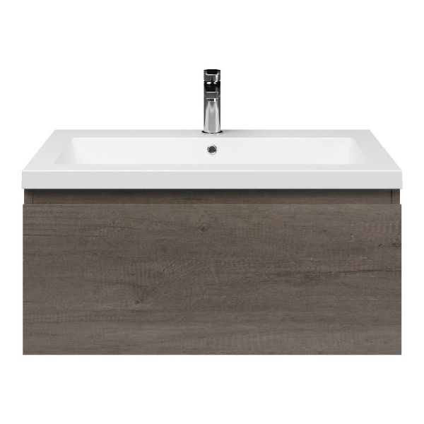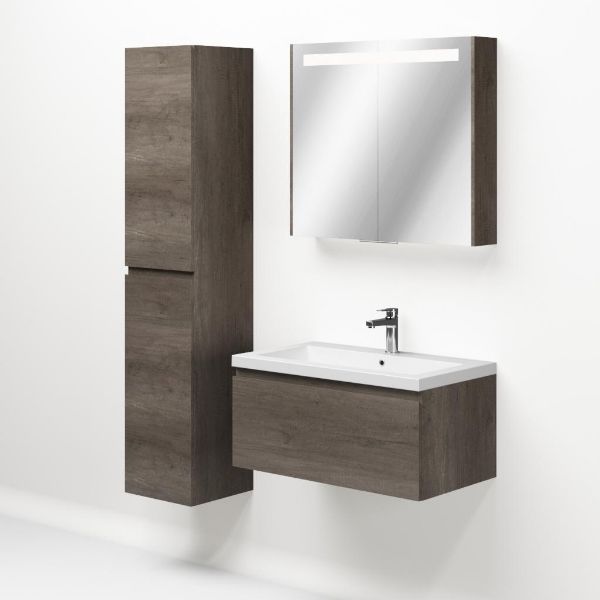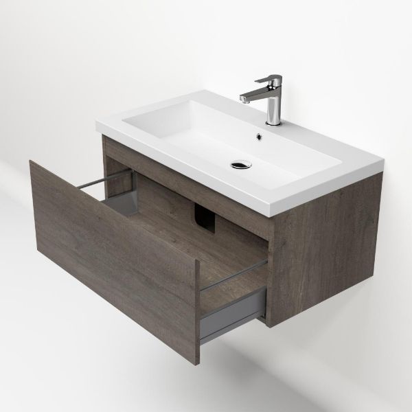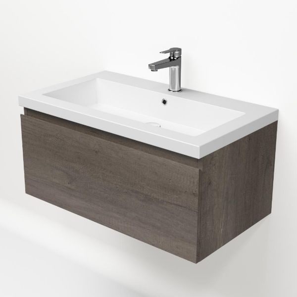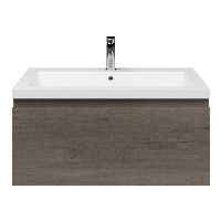 Greeploos badkamermeubel in de kleur olm donker grijs is 80 cm breed. De wastafel is vervaardig in quartz en heeft de kleur wit mat quartz. Dit badkamermeubel met deze wastafel is leverbaar tussen de 60 cm t/m 160 cm