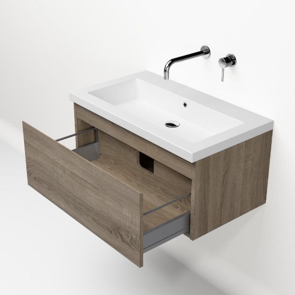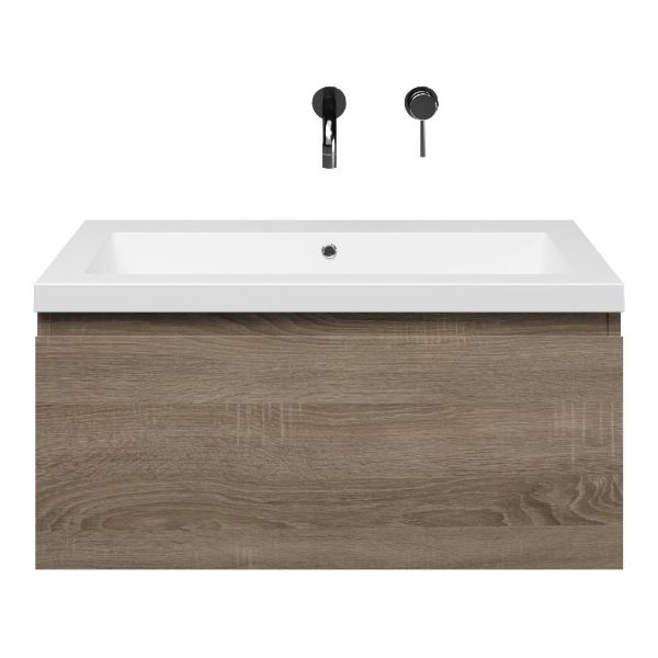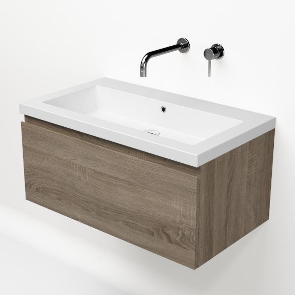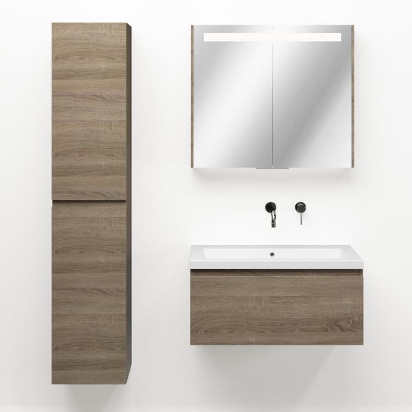 Greeploos badkamermeubel in de kleur eiken donker is 80 cm breed. De wastafel is vervaardig in quartz en heeft de kleur wit mat quartz. Dit badkamermeubel met deze wastafel is leverbaar tussen de 60 cm t/m 160 cm