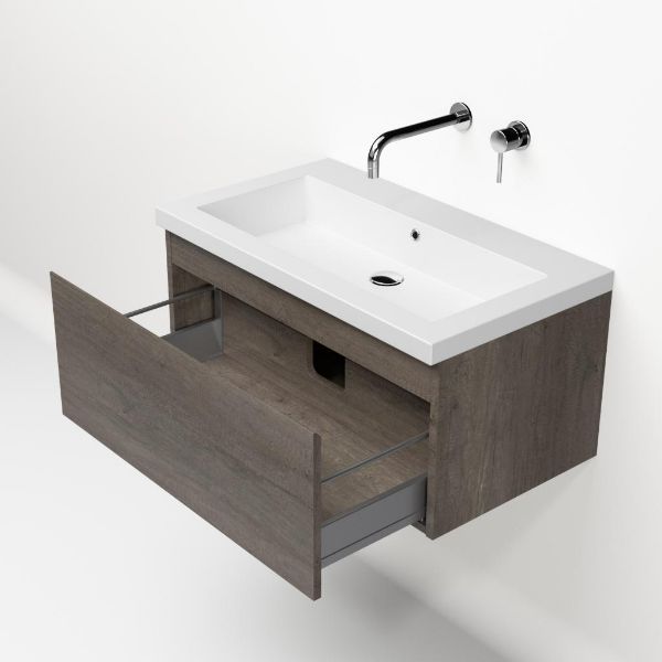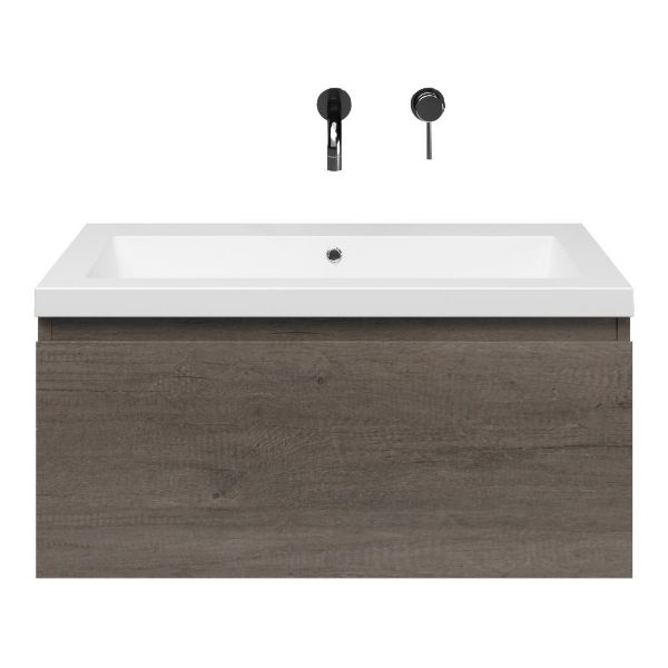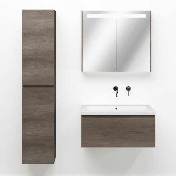Greeploos badkamermeubel in de kleur olm donker grijs is 80 cm breed. De wastafel is vervaardig in quartz en heeft de kleur wit mat quartz. Dit badkamermeubel met deze wastafel is leverbaar tussen de 60 cm t/m 160 cm