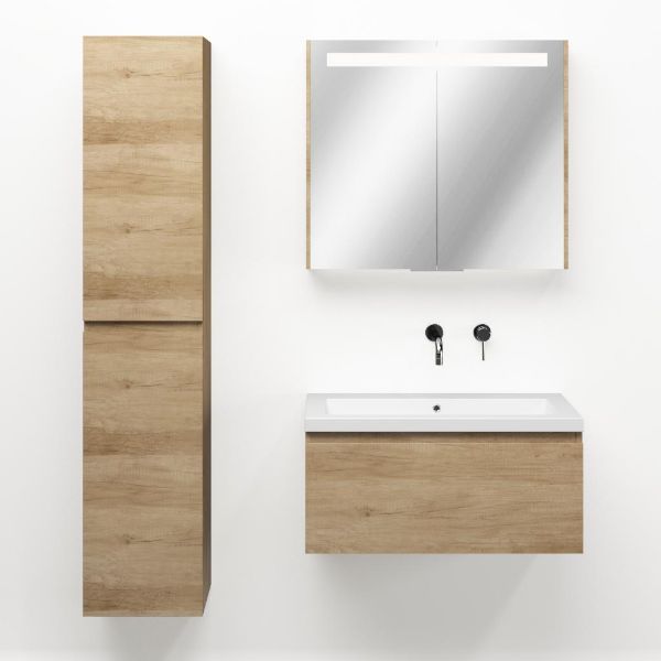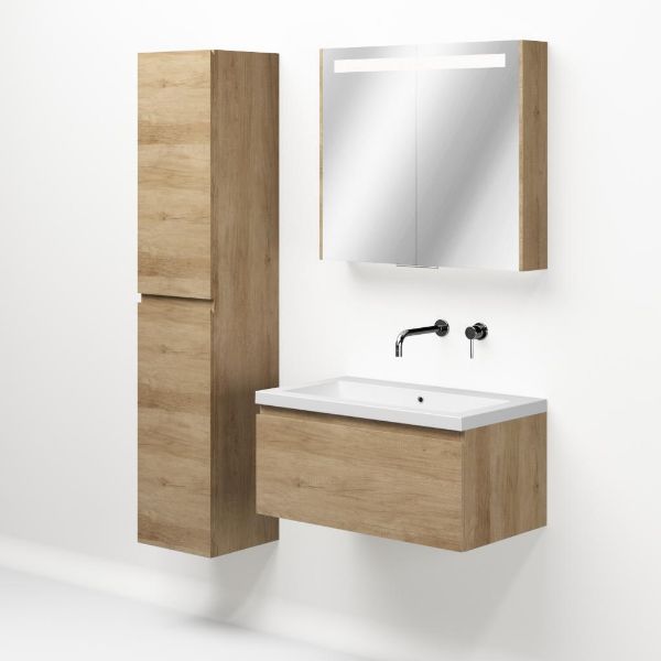 Greeploos badkamermeubel in de kleur olm is 80 cm breed.  De wastafel is vervaardig in quartz en heeft de kleur wit mat quartz. Dit badkamermeubel met deze wastafel is leverbaar tussen de 60 cm t/m 160 cm