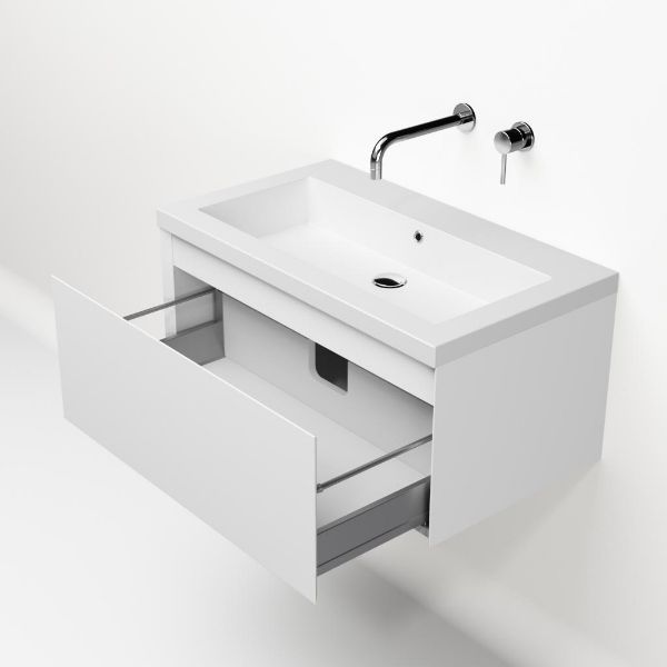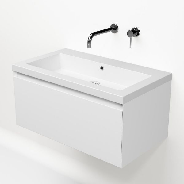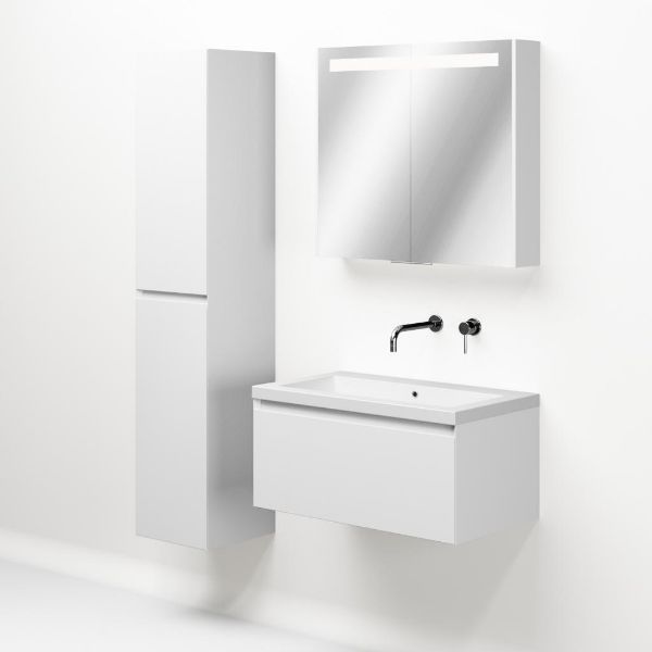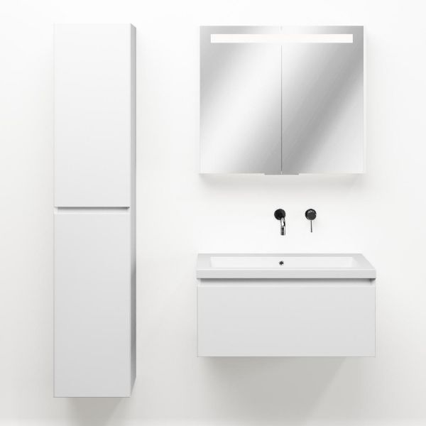 Greeploos badkamermeubel in de kleur wit mat is 80 cm breed. De wastafel is vervaardig in quartz en heeft de kleur wit mat quartz. Dit badkamermeubel met deze wastafel is leverbaar tussen de 60 cm t/m 160 cm