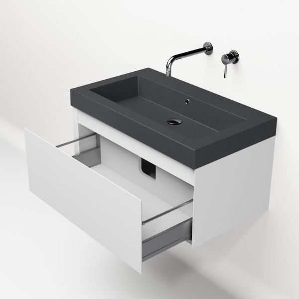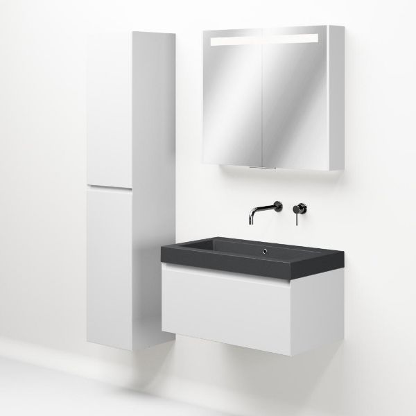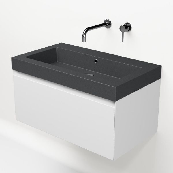 Greeploos badkamermeubel in de kleur wit mat is 80 cm breed.  De wastafel is vervaardig in quartz en heeft de kleur grijs mat quartz. Dit badkamermeubel met deze wastafel is leverbaar tussen de 60 cm t/m 160 cm