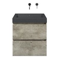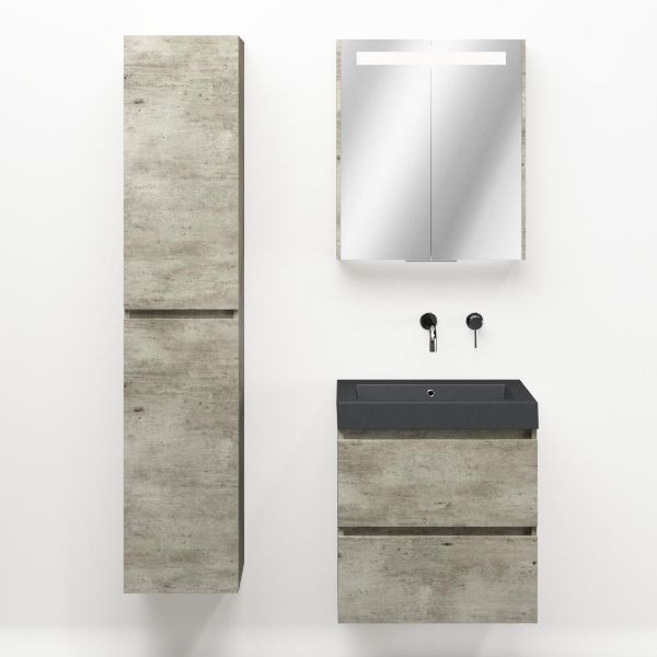 Greeploos badkamermeubel in de kleur steigerhout licht grijs is 60 cm breed.  De wastafel is vervaardig in quartz en heeft de kleur grijs mat quartz. Dit badkamermeubel met deze wastafel is leverbaar tussen de 60 cm t/m 200 cm