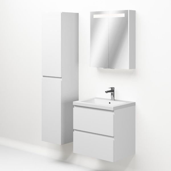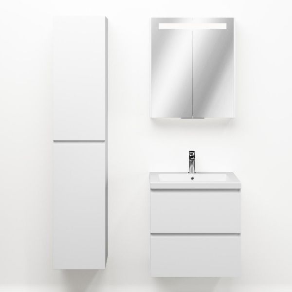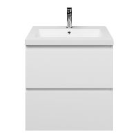 Greeploos badkamermeubel in de kleur wit mat is 60 cm breed. De wastafel is vervaardig in quartz en heeft de kleur wit mat quartz. Dit badkamermeubel met deze wastafel is leverbaar tussen de 60 cm t/m 200 cm