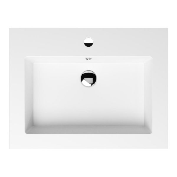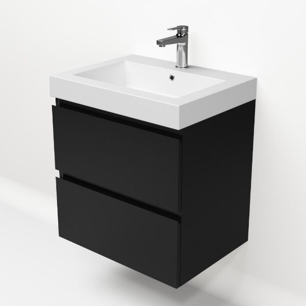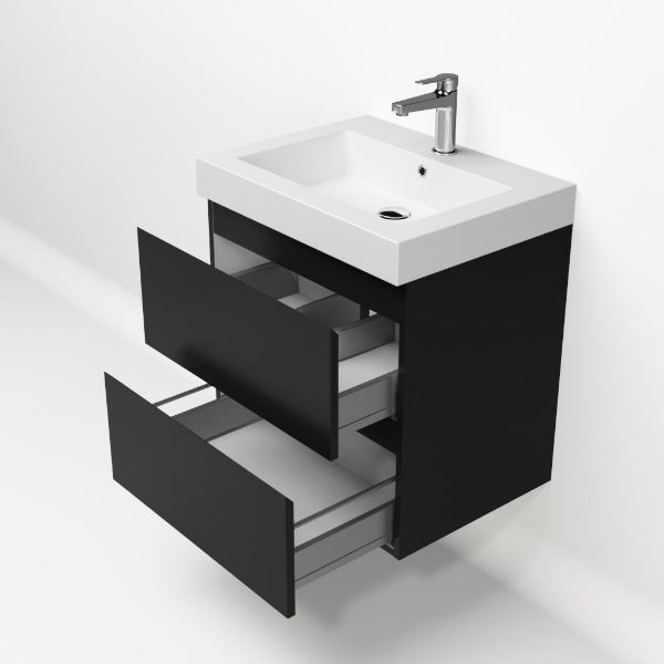 Greeploos badkamermeubel in de kleur zwart mat is 60 cm breed. De wastafel is vervaardig in quartz en heeft de kleur wit mat quartz. Dit badkamermeubel met deze wastafel is leverbaar tussen de 60 cm t/m 200 cm