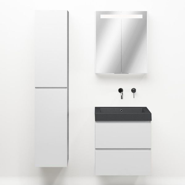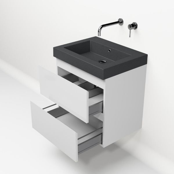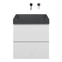 Greeploos badkamermeubel in de kleur wit hoogglans is 60 cm breed.  De wastafel is vervaardig in quartz en heeft de kleur grijs mat quartz. Dit badkamermeubel met deze wastafel is leverbaar tussen de 60 cm t/m 200 cm