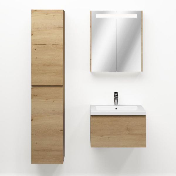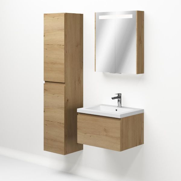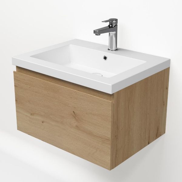 Greeploos badkamermeubel in de kleur eiken natuur is 60 cm breed. De wastafel is vervaardig in quartz en heeft de kleur wit mat quartz. Dit badkamermeubel met deze wastafel is leverbaar tussen de 60 cm t/m 160 cm