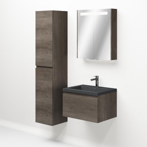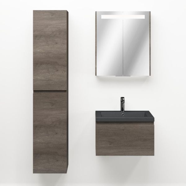 Greeploos badkamermeubel in de kleur olm donker grijs is 60 cm breed.  De wastafel is vervaardig in quartz en heeft de kleur grijs mat quartz. Dit badkamermeubel met deze wastafel is leverbaar tussen de 60 cm t/m 160 cm