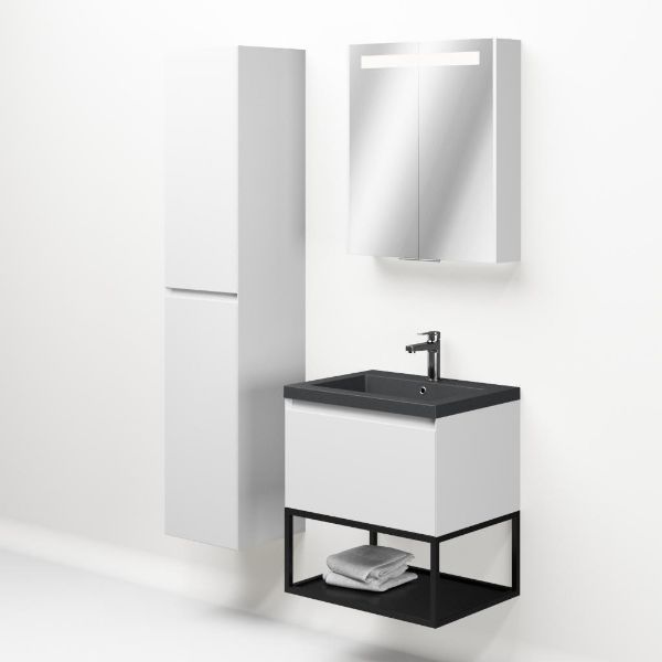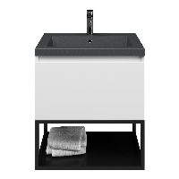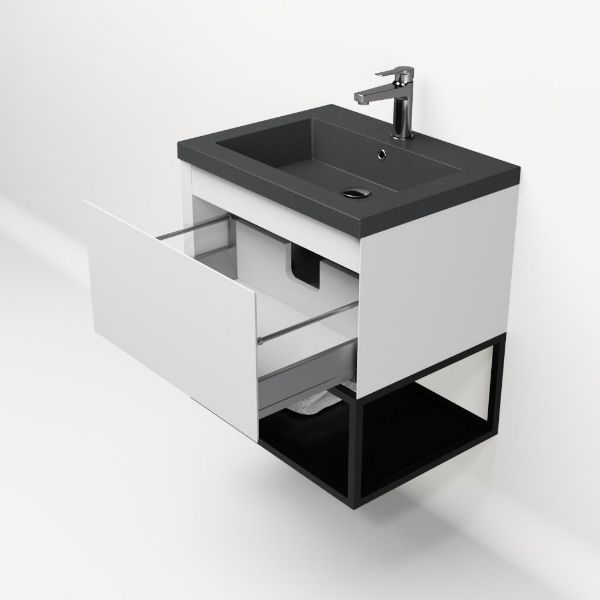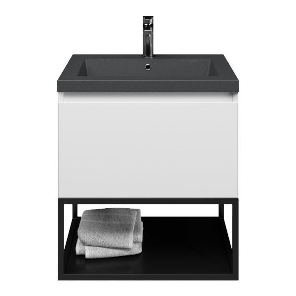 Bellanti Solo/Tela/Esta-Q badmeubel 60x46 1 softclose lade wit mat greeploos quartz wastafel mat grijs met 1 kraangat met mat zwart metalen frame