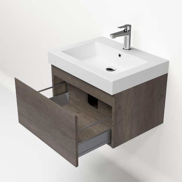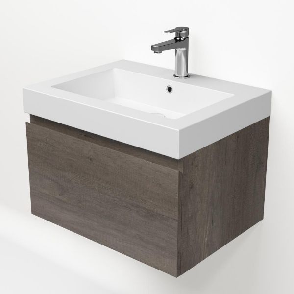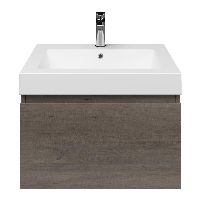Greeploos badkamermeubel in de kleur olm donker grijs is 60 cm breed. De wastafel is vervaardig in quartz en heeft de kleur wit mat quartz. Dit badkamermeubel met deze wastafel is leverbaar tussen de 60 cm t/m 160 cm