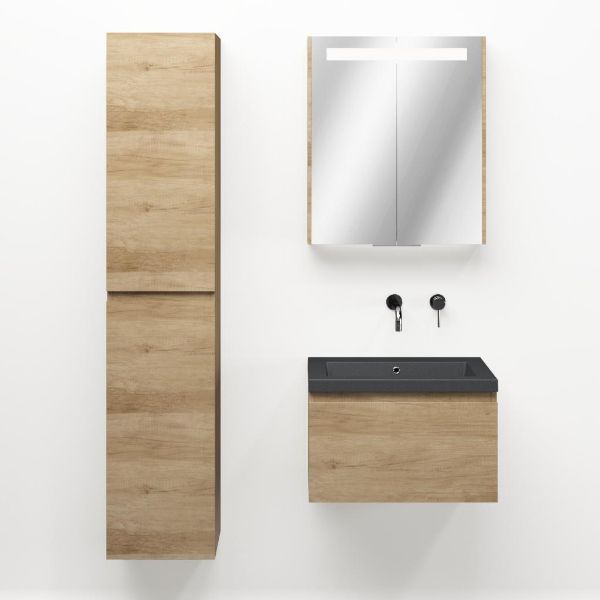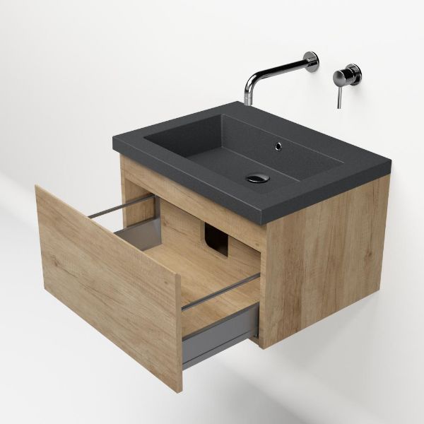 Greeploos badkamermeubel in de kleur olm is 60 cm breed.  De wastafel is vervaardig in quartz en heeft de kleur grijs mat quartz. Dit badkamermeubel met deze wastafel is leverbaar tussen de 60 cm t/m 160 cm