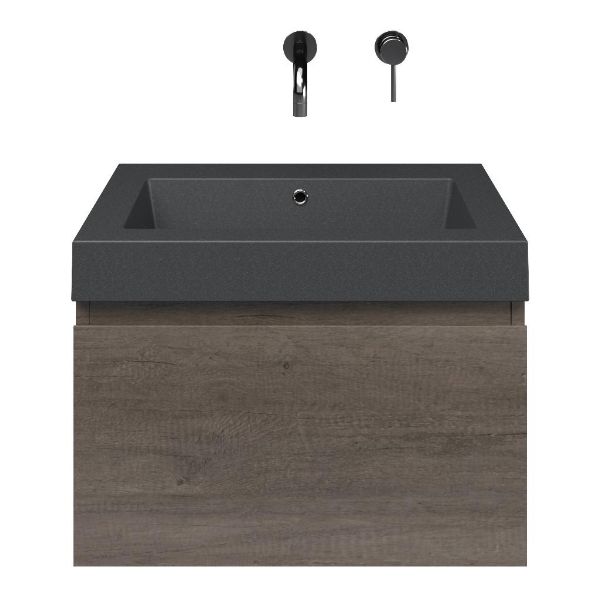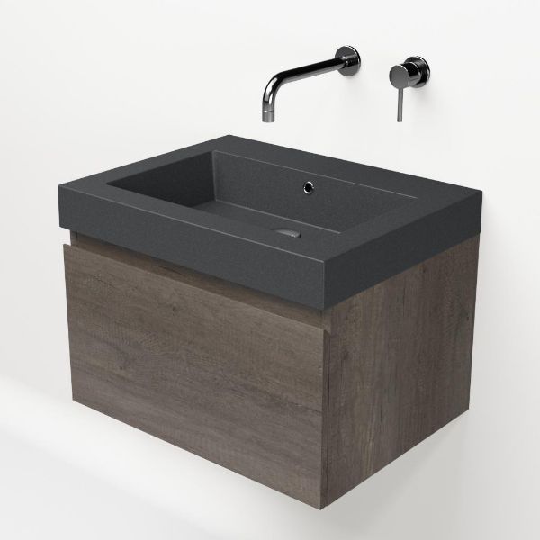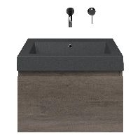 Greeploos badkamermeubel in de kleur olm donker grijs is 60 cm breed.  De wastafel is vervaardig in quartz en heeft de kleur grijs mat quartz. Dit badkamermeubel met deze wastafel is leverbaar tussen de 60 cm t/m 160 cm