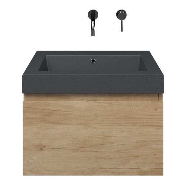 Greeploos badkamermeubel in de kleur olm is 60 cm breed. De wastafel is vervaardig in quartz en heeft de kleur grijs mat quartz. Dit badkamermeubel met deze wastafel is leverbaar tussen de 60 cm t/m 160 cm