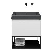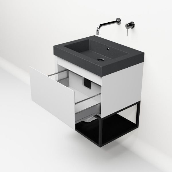 Bellanti Solo/Tela/Esta-Q badmeubel 60x46 1 softclose lade wit mat greeploos quartz wastafel mat grijs zonder kraangaten met mat zwart metalen frame