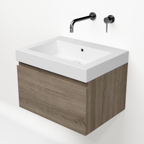 Greeploos badkamermeubel in de kleur eiken donker is 60 cm breed. De wastafel is vervaardig in quartz en heeft de kleur wit mat quartz. Dit badkamermeubel met deze wastafel is leverbaar tussen de 60 cm t/m 160 cm