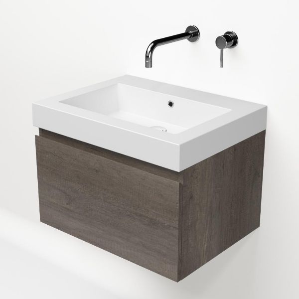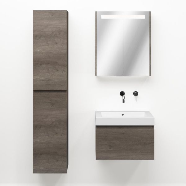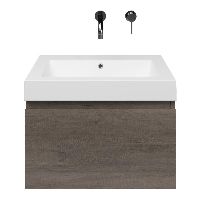 Greeploos badkamermeubel in de kleur olm donker grijs is 60 cm breed. De wastafel is vervaardig in quartz en heeft de kleur wit mat quartz. Dit badkamermeubel met deze wastafel is leverbaar tussen de 60 cm t/m 160 cm