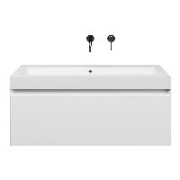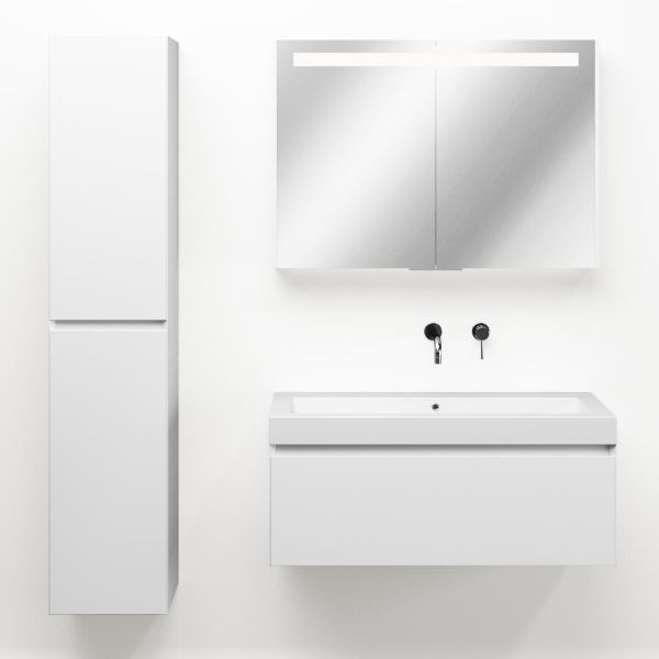 Greeploos badkamermeubel in de kleur wit mat is 100 cm breed. De wastafel is vervaardig in quartz en heeft de kleur wit mat quartz. Dit badkamermeubel met deze wastafel is leverbaar tussen de 60 cm t/m 160 cm