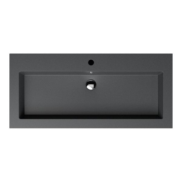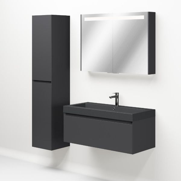 Greeploos badkamermeubel in de kleur antraciet mat is 100 cm breed. De wastafel is vervaardig in quartz en heeft de kleur grijs mat quartz. Dit badkamermeubel met deze wastafel is leverbaar tussen de 60 cm t/m 160 cm