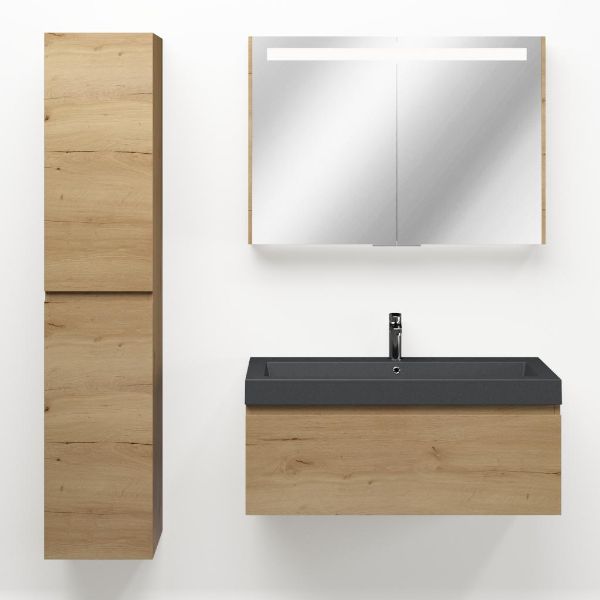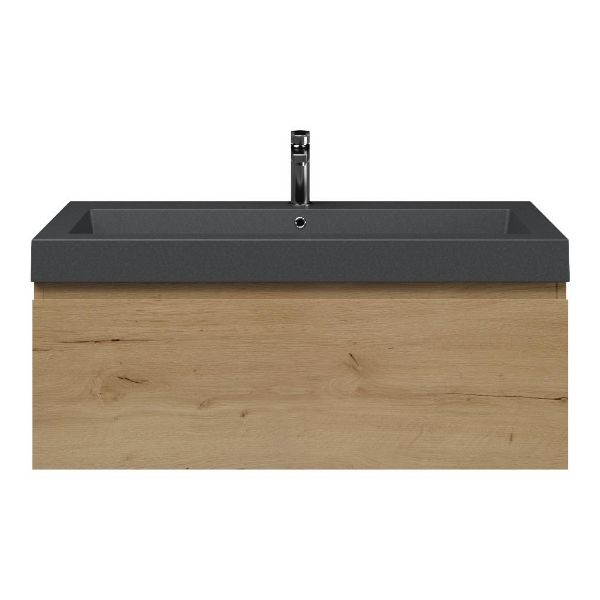 Greeploos badkamermeubel in de kleur eiken natuur is 100 cm breed. De wastafel is vervaardig in quartz en heeft de kleur grijs mat quartz. Dit badkamermeubel met deze wastafel is leverbaar tussen de 60 cm t/m 160 cm