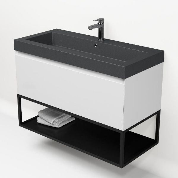 Bellanti Solo/Tela/Esta-Q badmeubel 100x46 1 softclose lade wit hoogglans greeploos quartz wastafel mat grijs met 1 kraangat met mat zwart metalen frame