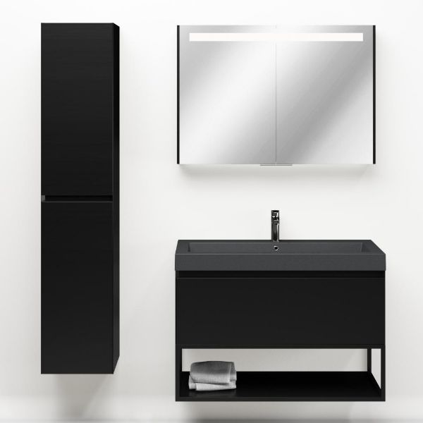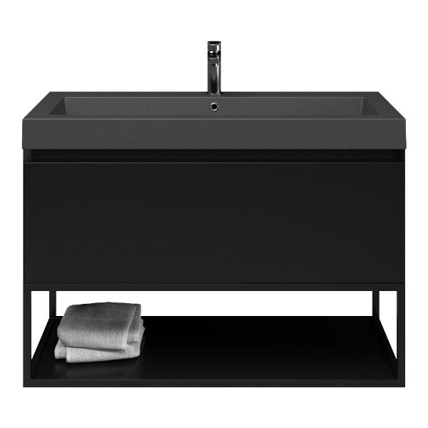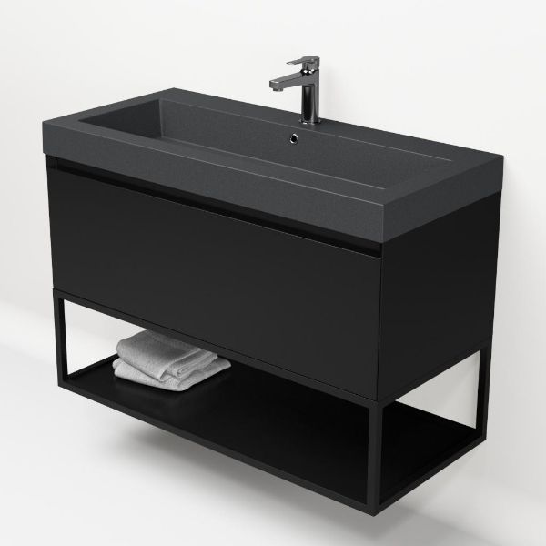 Greeploos badkamermeubel in de kleur zwart mat is 100 cm breed.  De wastafel is vervaardig in quartz en heeft de kleur grijs mat quartz. Dit badkamermeubel met deze wastafel is leverbaar tussen de 60 cm t/m 160 cm