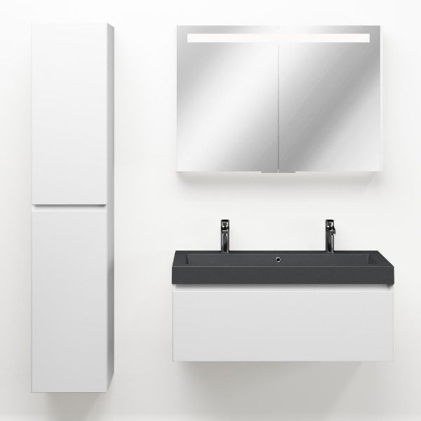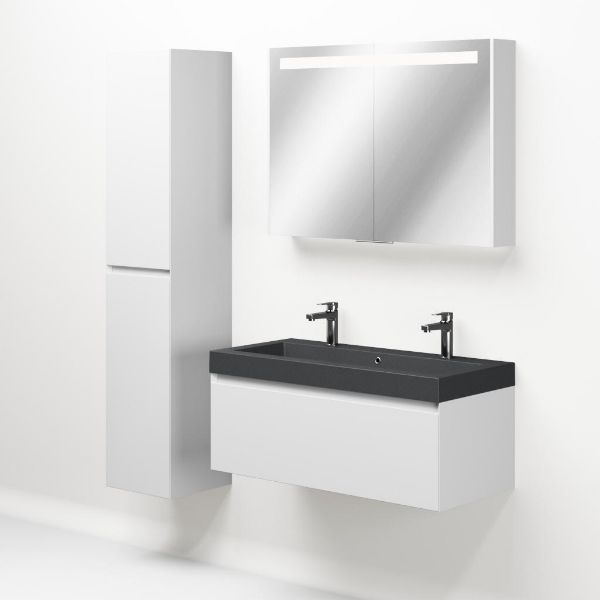Greeploos badkamermeubel in de kleur wit mat is 100 cm breed. De wastafel is vervaardig in quartz en heeft de kleur grijs mat quartz. Dit badkamermeubel met deze wastafel is leverbaar tussen de 60 cm t/m 160 cm