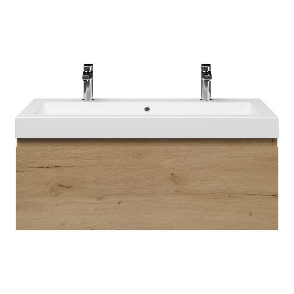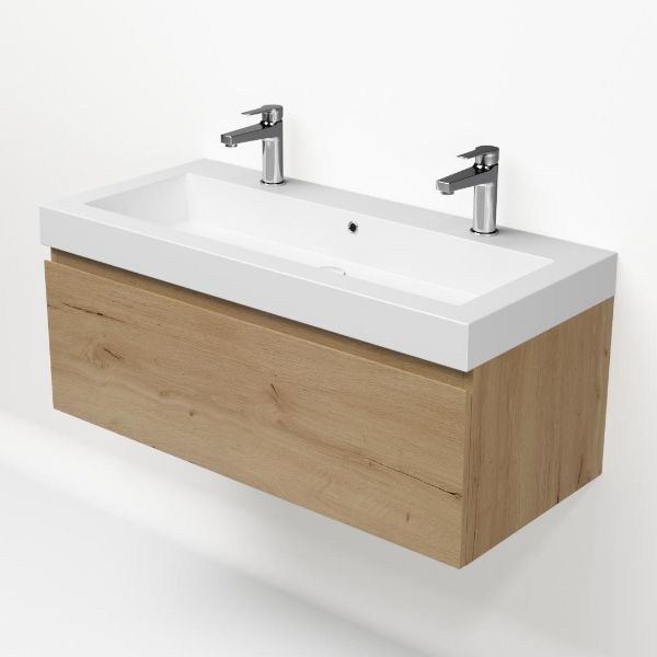 | Bellanti Solo/Esta-Q badmeubel 100x46 1 softclose lade eiken natuur greeploos quartz wastafel mat wit met 2 kraangaten |