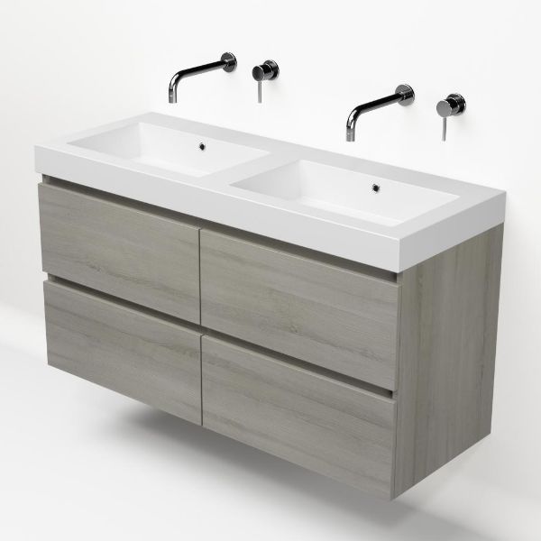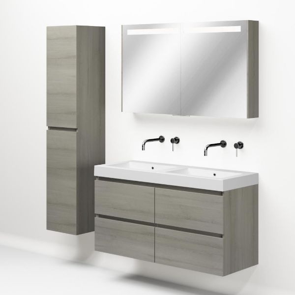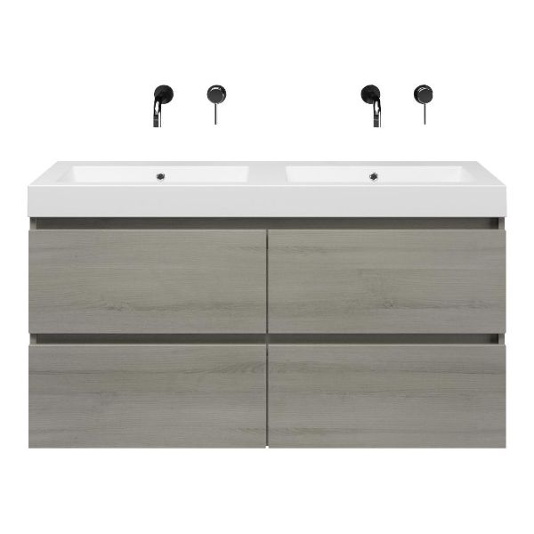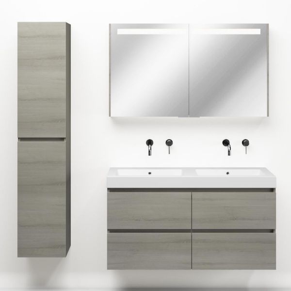 | | Bellanti Elena/Esta-Q badmeubel 120x46 4 softclose laden eiken licht grijs greeploos quartz wastafel dubbel mat wit zonder kraangaten |