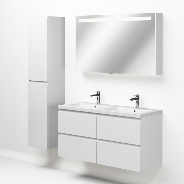 Greeploos badkamermeubel in de kleur wit hoogglans is 120 cm breed. De wastafel is vervaardig in quartz en heeft de kleur wit mat quartz. Dit badkamermeubel met deze wastafel is leverbaar tussen de 60 cm t/m 200 cm