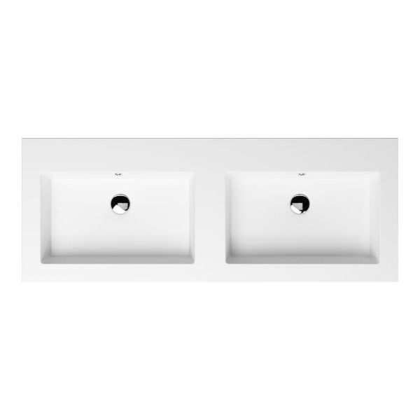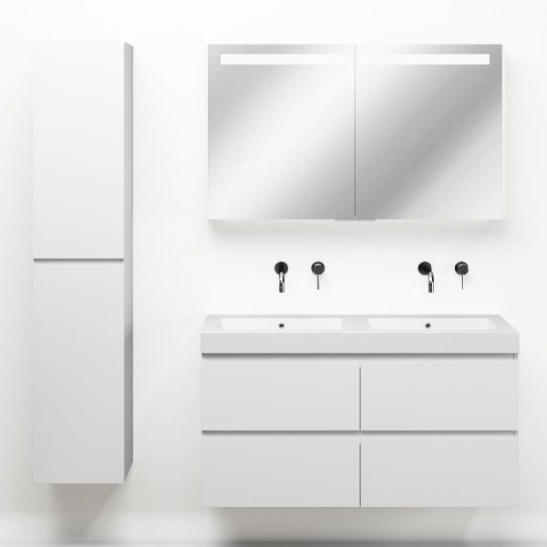 Greeploos badkamermeubel in de kleur wit mat is 120 cm breed. De wastafel is vervaardig in quartz en heeft de kleur wit mat quartz. Dit badkamermeubel met deze wastafel is leverbaar tussen de 60 cm t/m 200 cm