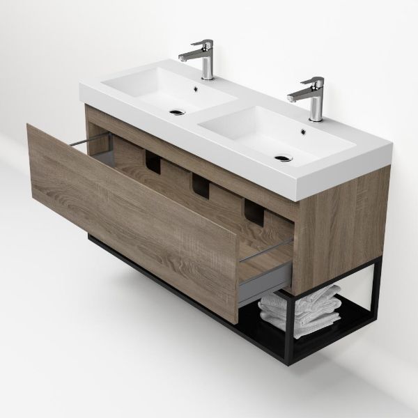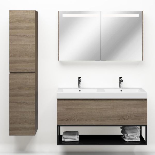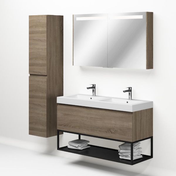 | | Bellanti Solo/Tela/Esta-Q badmeubel 120x46 1 softclose lade eiken donker greeploos quartz wastafel dubbel mat wit met 2 kraangaten met mat zwart metalen frame |