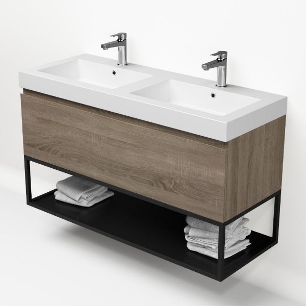 | Bellanti Solo/Tela/Esta-Q badmeubel 120x46 1 softclose lade eiken donker greeploos quartz wastafel dubbel mat wit met 2 kraangaten met mat zwart metalen frame |