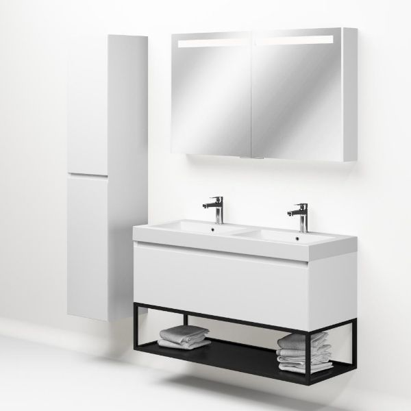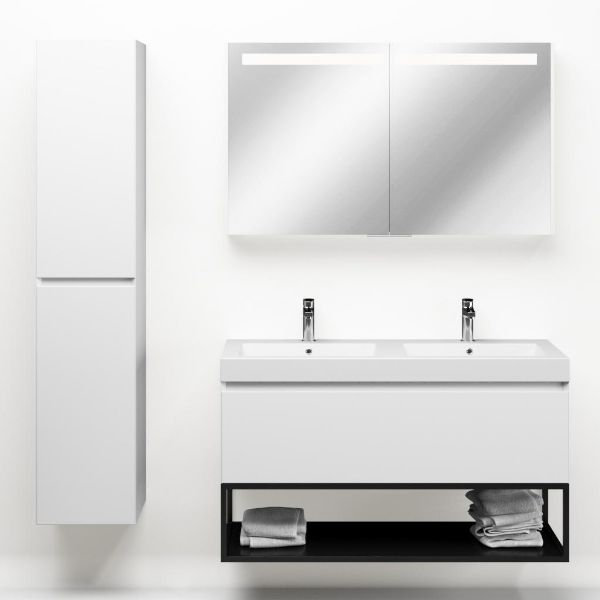 | Bellanti Solo/Tela/Esta-Q badmeubel 120x46 1 softclose lade wit mat greeploos quartz wastafel dubbel mat wit met 2 kraangaten met mat zwart metalen frame |
