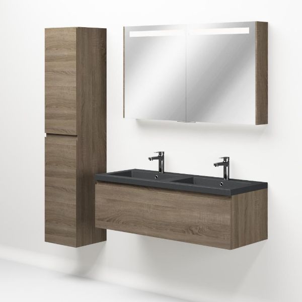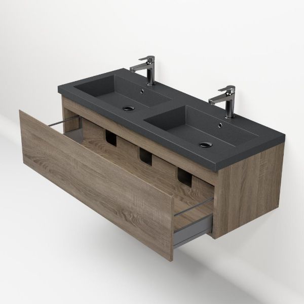 | | Bellanti Solo /Esta-Q badmeubel 120x46 1 softclose lade eiken donker greeploos quartz wastafel dubbel mat grijs met 2 kraangaten |